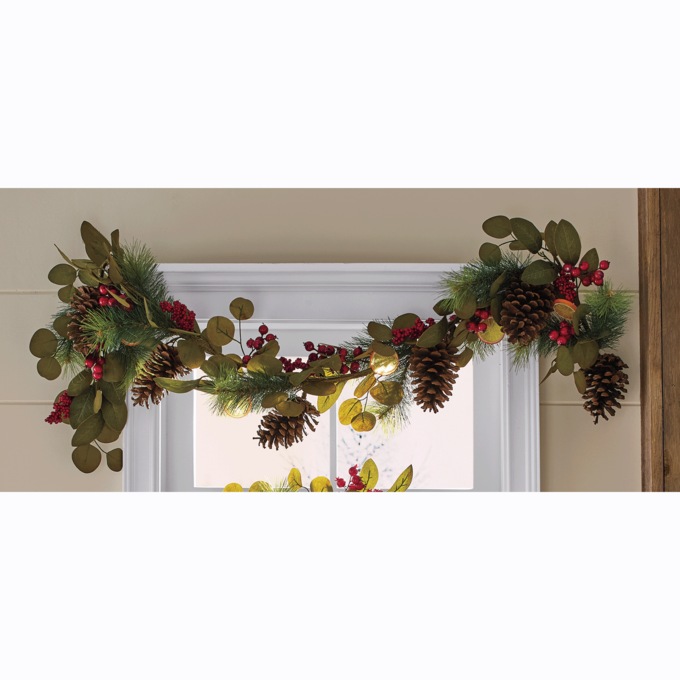 Enjoy this striking take on winter’s bounty! Colorful faux orange slices and berries mix with natural pinecones on paper- and wire-wrapped garland. 60” l x 10” w x 4” h.