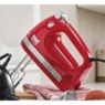 This hand mixer comes with everything you need! With 5 speeds, plus turbo boost, it gets the job done with ease. Includes hand mixer, 2 steel beaters with silicone coating (it won't scratch your mixing bowl), 2 steel dough hooks, stainless steel whisk and steel immersion blender attachment. Hand wash. 8" l x 3.5" w x 5.75" h.