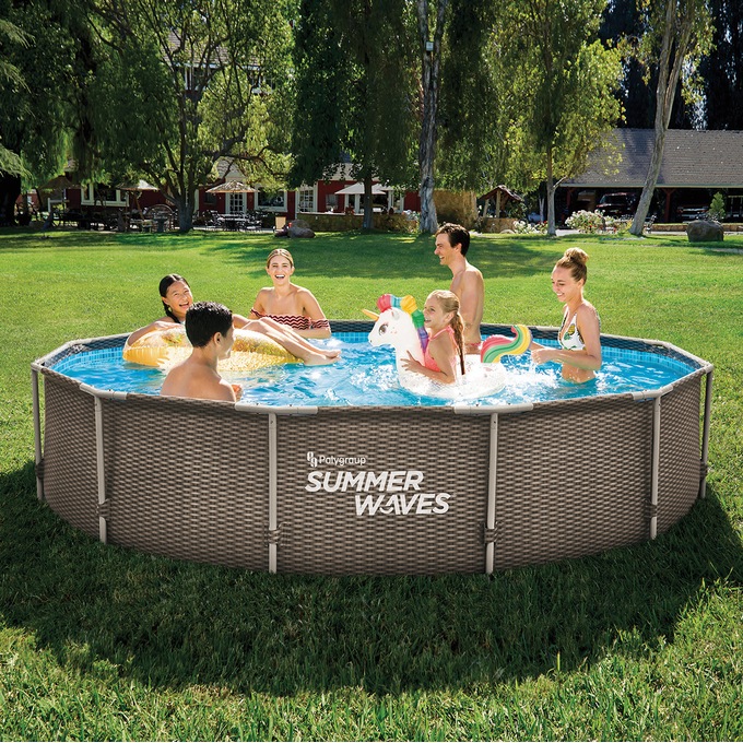 Spend hours in your backyard oasis swimming, entertaining or relaxing. Pool holds up to 6 people. 1836-gallon capacity. 600-gallon filter pump. Tubular steel frame with heavy-duty PVC and polyester 3-ply side walls. Has a stylish dark rattan print. 12' diam. x 2' 6" h.